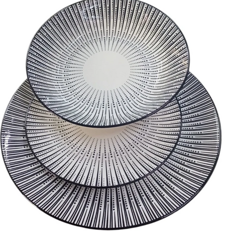 Prezzo normale €60,00 EURPrezzo unitario /Non disponibileIn esaurimento (1 unità)DueEsse- Servizio Piatti 18 pezzi porcellana decoro vintage nero